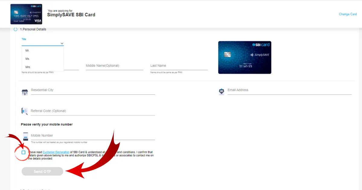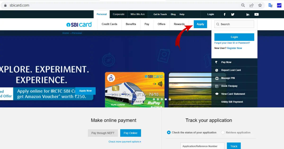 step no. 1 जब आप गूगल में https://www.sbicard.com सर्च करेंगे तो आपके सामने एसबीआई की क्रेडिट कार्ड वाली वेबसाइट ओपन हो जाएगी उसमें आपने अप्लाई पर क्लिक करना है जो नीचे दी गई पिक्चर में लाल रंग की एरो से दिखाया गया है, जैसे ही अप्लाई पर क्लिक करेंगे तो आगे —