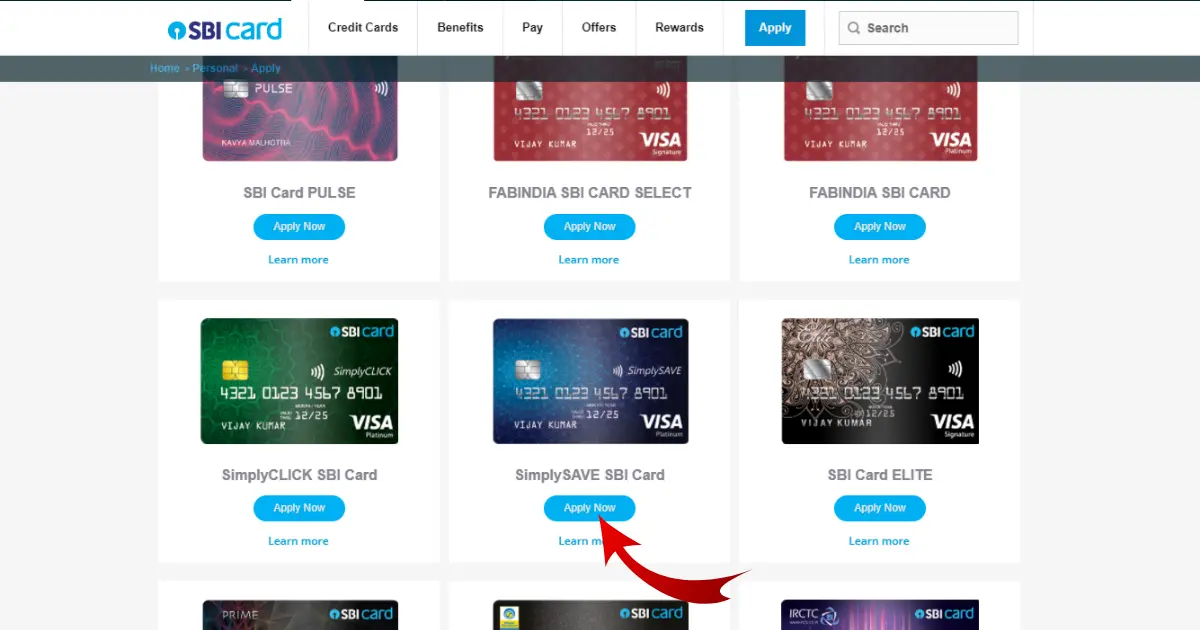 step no .2 जब आप अप्लाई पर क्लिक करेंगे तो आपके सामने कई कार्डों की लिस्ट आ जाएगी, आपको जिस कार्ड की जरूरत है, उसके नीचे अप्लाई पर क्लिक करके तो आप वह कार्ड ले सकते हैं जैसे मैं एसबीआई का simply save sbi card अप्लाई कर रहा हूं। मैंने नीचे एक लाल arrow का निशान दिया है, उस पर क्लिक करें|