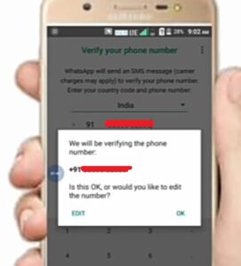 इस वंदो में आपको जे सुनिचत करना है के जो मोबाइल नंबर आपने इन्टर किया था वो सही है,मैंने आपने मोबाइल पर लाल रंग कर दिया,जहाँ पर आपका मोबाइल नंबर दिखाई देगा, अगर आपको लगता है के मोबाइल जो आपने इन्टर किया था वोह गलत है,तो आप edit वाले बटन पर क्लिक करे और दुबारा अपना मोबाइल नंबर इन्टर कर सकते है , अगर मोबाइल नंबर सही है जिसमे आपको whatsapp चालू करना है तो ok वाले बटन पर क्लिक करे |