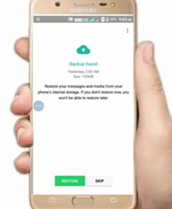 इस पिक्चर में आपने यादा धेयान देना है, इस में आपको जे पूछा गया है एक आपके पास अगर पहले से व्हात्साप चालू था और आप उसे फिर से whatsapp चालू करना है जो किसी कारन delete हो गया था अगर आप उसे दुबारा restore हो करना चाहते है, जेसे पहले चल रहा था,सारे massage, picture, video आ जाये तो आपने restore वाले बटन पर क्लिक करना है,अगर नहीं करना चाहते तो skip वाले बटन पर क्किच्क करे|