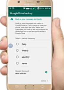 निचे दी गयी पिक्चर में आप से पूछा गया है के अगर आपकी कोई पर्सनल पिक्चर ,विडियो , यां कोई massage डिलीट हो जाता है तो आप व्हात्साप का backup ले सकते है जेसे की daily,weekly,monthly आपको तीनो में से कोई भी सलेक्ट कर सकते है अगर आपको backup नहीं चाहिए तो आप never पर क्लिक करके done पर क्लिक करे|